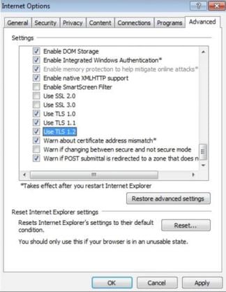 Steps to enable TLSv1.2 in Microsoft Internet Explorer