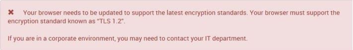 If the browser does not support TLSv1.2 the customer will receive the following page which has TLS 1.0 and TLS 1.1 disabled.